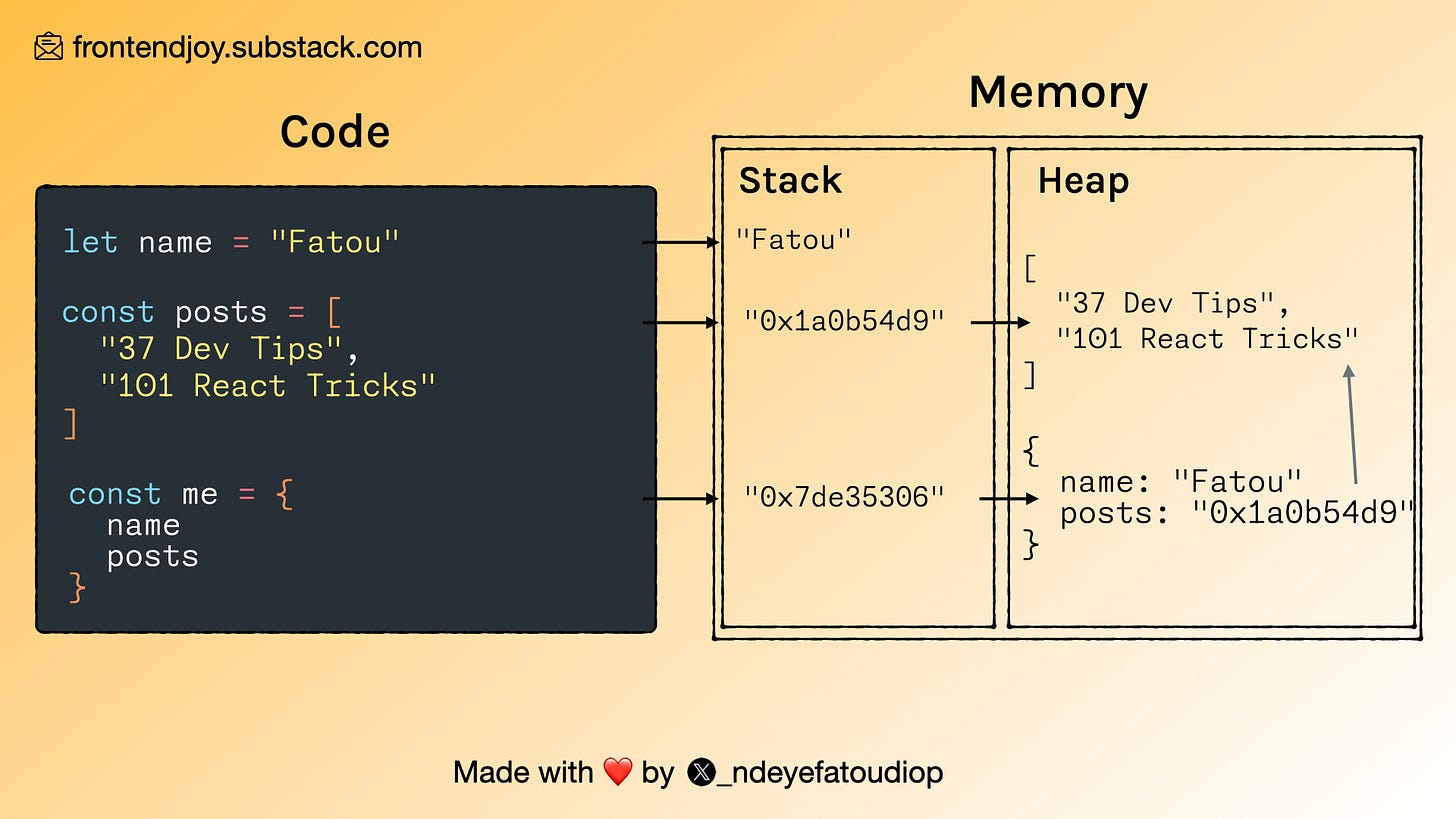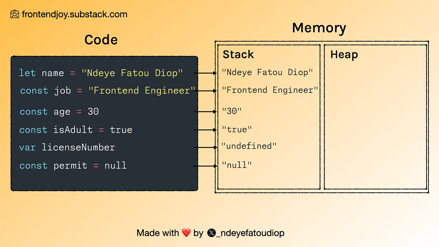 Stack: Stores static data (data with a fixed size). Since primitive values are immutable and won't change, they will be stored here.